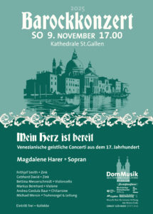 Schon im 17. Jahrhundert war die mitteleuropäische Musikszene ein eng vernetztes Miteinander: Selbst die Alpen behinderten den Austausch zwischen Nord und Süd nicht. So fanden die bahnbrechend neuartigen venezianischen Kompositionen des Frühbarock schnell ihren Weg in unsere Gefilde. Die Sopranistin Magdalene Harer, Spezialistin für die monodische Musik jener Zeit, lässt uns mit ihrem Gesang erahnen, wie der spektakuläre italienische Stil seinerzeit europaweit «eingeschlagen» haben muss. Es begleitet das «Collegium Instrumentale der Kathedrale St.Gallen», diesmal stilgemäss mit zwei Zinken (Cornetti) in den Oberstimmen, unter Leitung von Michael Wersin auf historischen Instrumenten der Barockzeit.