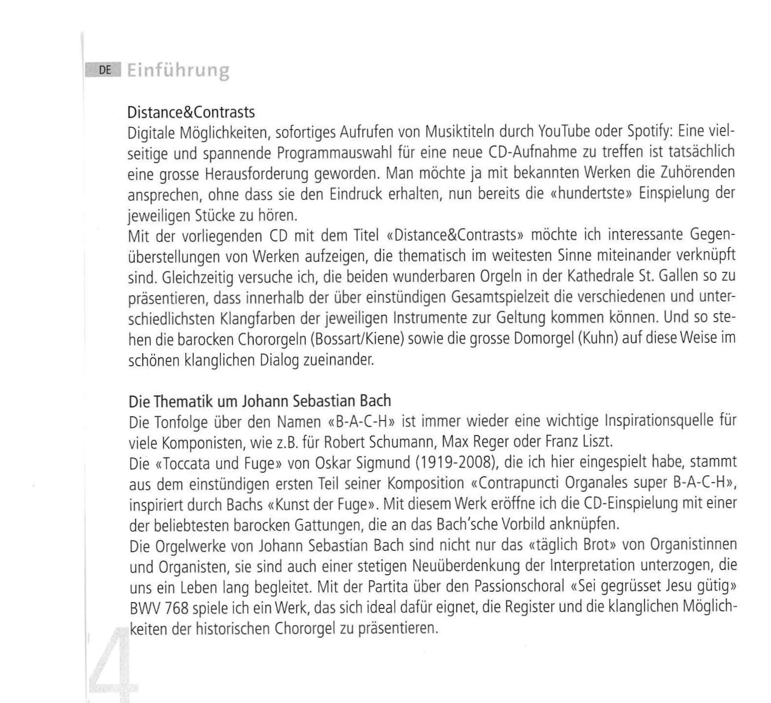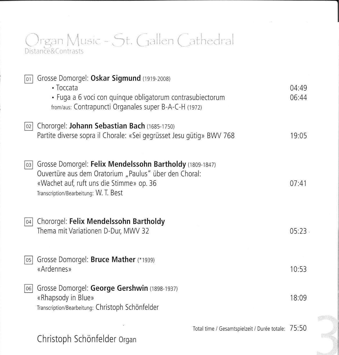 Die erste CD „Distance & Contrasts“ von Domorganist Christoph Schönfelder beinhaltet eine vielseitige Programmauswahl mit spannenden Gegenüberstellungen von Werken. Gleichzeitig ist es ihm in dieser einstündigen Gesamtspielzeit gelungen, die unterschiedlichsten Klangfarben aus den Orgeln der Kathedrale zur Geltung zu bringen. Im schönen Booklet geht Schönfelder kurz zu seinen gespielten Werken von Johann Sebastian Bach, Oskar Sigmund, Felix Mendelssohn Bartholdy, Bruce Mather und George Gershwin ein.